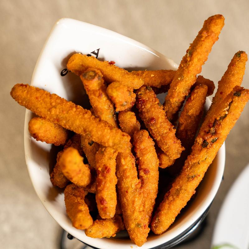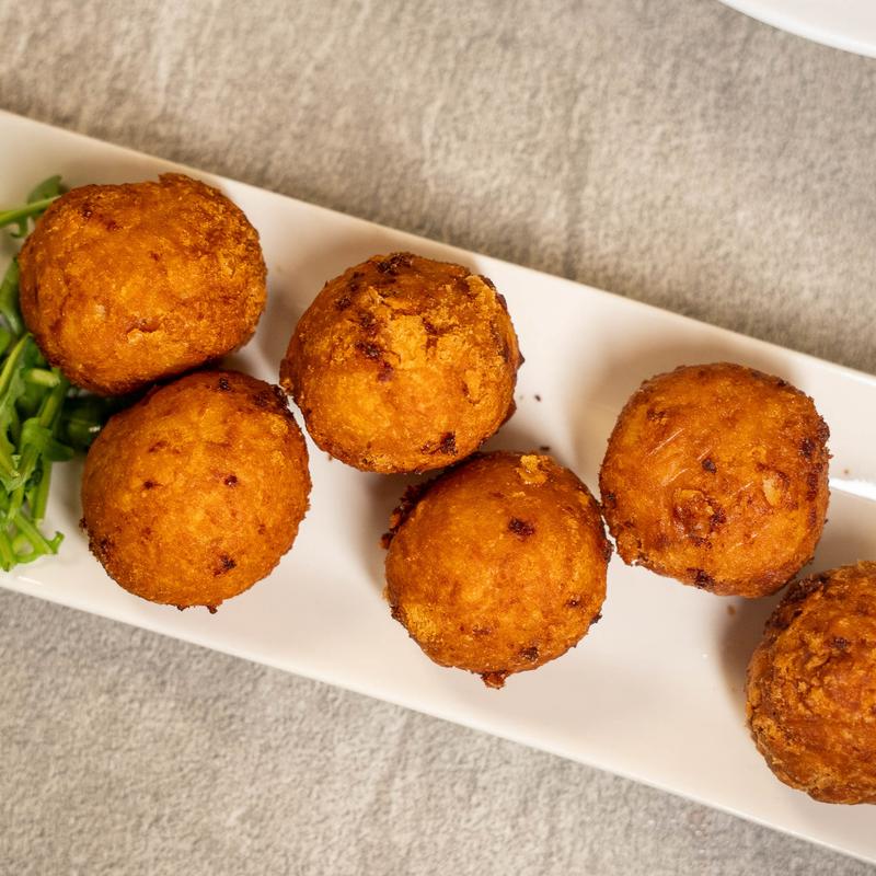 Ten sauced chicken wings, ten macaroni and cheese balls, ten golden fried shrimp, ten angel eggs, and spicy fried green beans. Accompanied by cornbread bites and sauces to wow you and your guests.