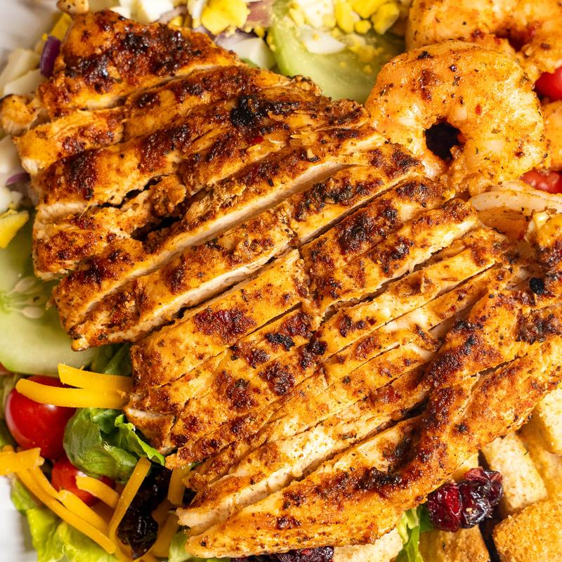 A lettuce blend with tomato, carrots, cucumber, red onion, and topped with eggs, cheese, cranberries, and croutons • Add Chicken +$5.00 | Add Shrimp +$9.00