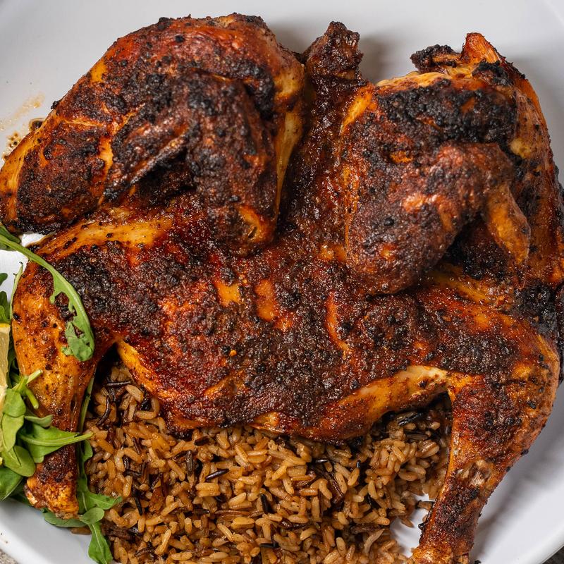 We remove the center bone, then season and beautifully roast our homestyle chicken. Served with seasoned rice.
